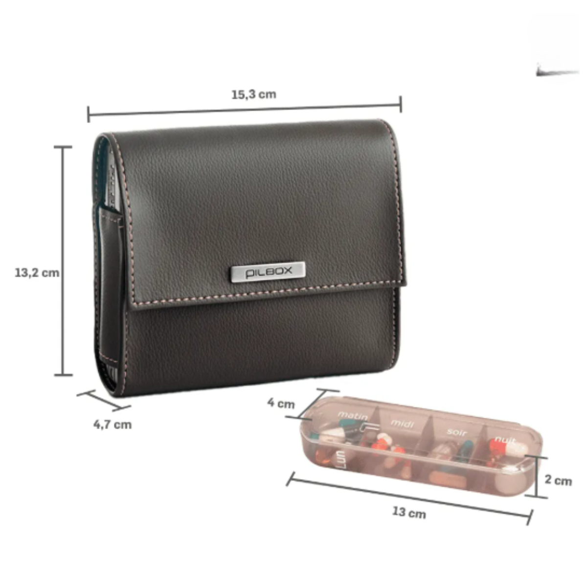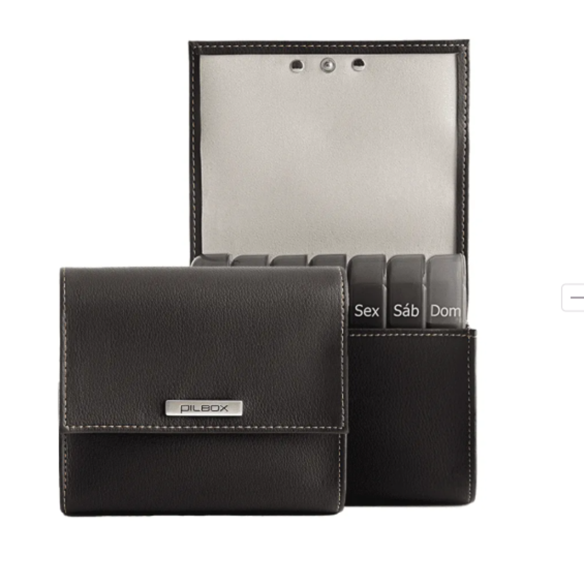 As marcações dos dias e horários são grandes e bem legíveis, com indicadores visuais e táteis para auxiliar pessoas com baixa visão. O acabamento em couro sintético ecológico oferece um visual discreto e sofisticado, ideal para levar em bolsas ou mochilas com discrição.